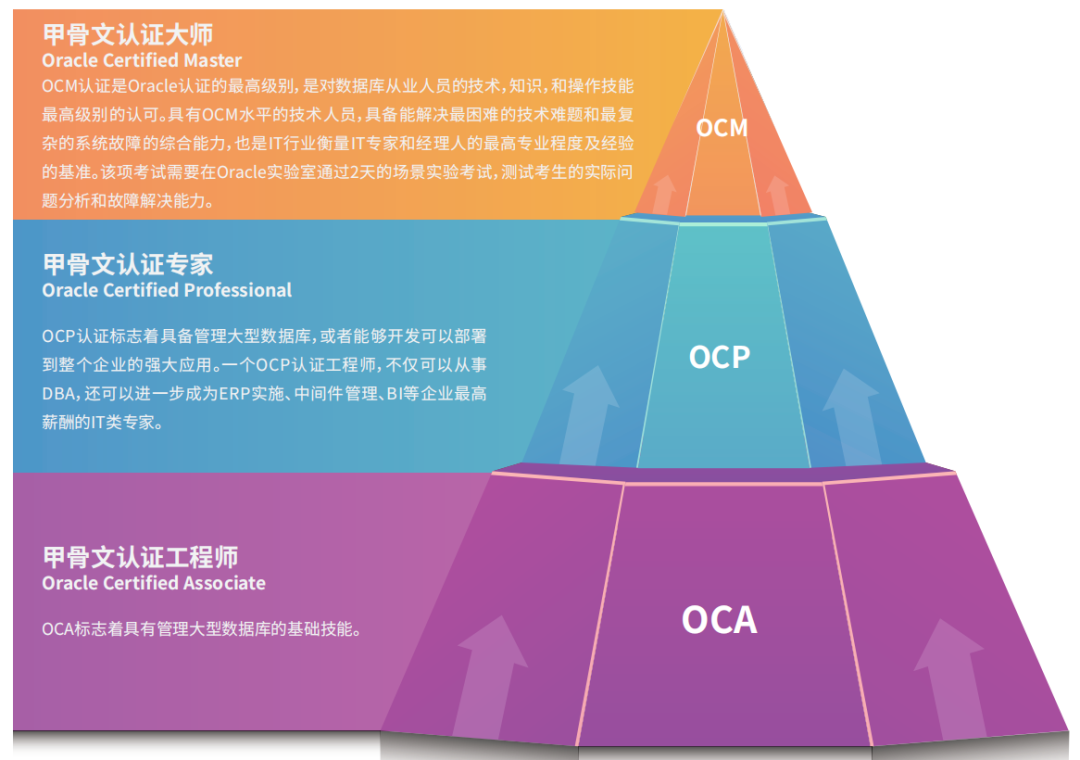 认证分为三个等级:OCA(甲骨文认证工程师)、OCP(甲骨文认证专家)和OCM(甲骨文认证大师)。