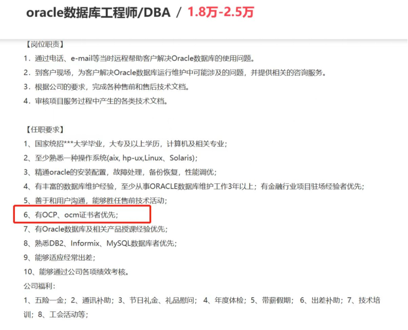 证书是敲门砖,无论是简历筛选还是面试,我们都很难在短时间内证明自己技术很厉害,而证书就是一个很不错的证明方式。不是说有了证书就能高枕无忧,但绝对是加分项。事实上,有时候没有证书可能连简历筛选这关都过不去。现在很多企业在招聘DBA岗位的时候也会优先考虑有证书的求职者,而且OCP认证不仅仅是一纸证书,它更是一种职业发展的加速器。