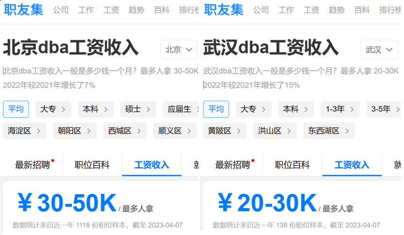 根据职友集最新数据统计,在北京这样的一线城市,DBA月薪能够达到30-50K;在武汉这样的非一线城市,月薪也能达到20-30K,调查数据显示,全国DBA的平均月薪为22.1K,年薪30w左右。